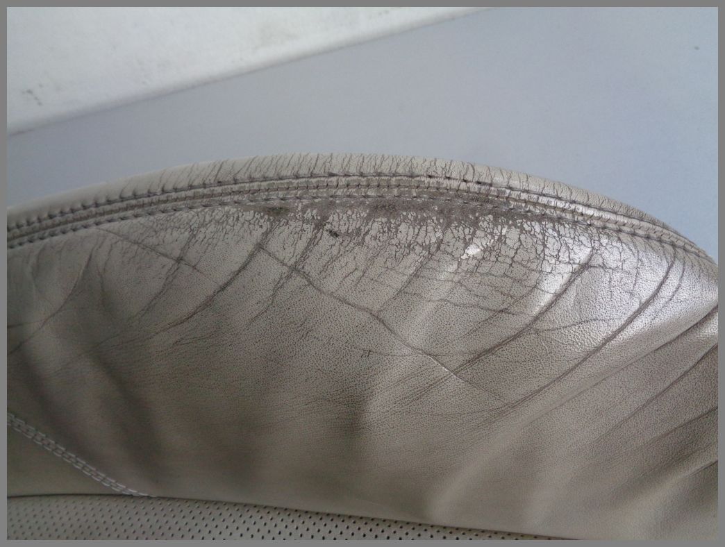 Das Sitzkissen bzw. Lehne aus Leder ist in einem gebrauchten Zustand. An der Einstiegswange ist ein Loch und das Leder ist stark verschlissen. Ideal zum beziehen oder neu einfärben Es können noch Druckstellen vom Lagern dazukommen.