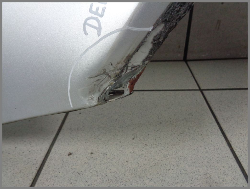 Die Kotflügel ist in einem gebrauchten Zustand. Es sind Rost sowie größere Dellen vorhanden.